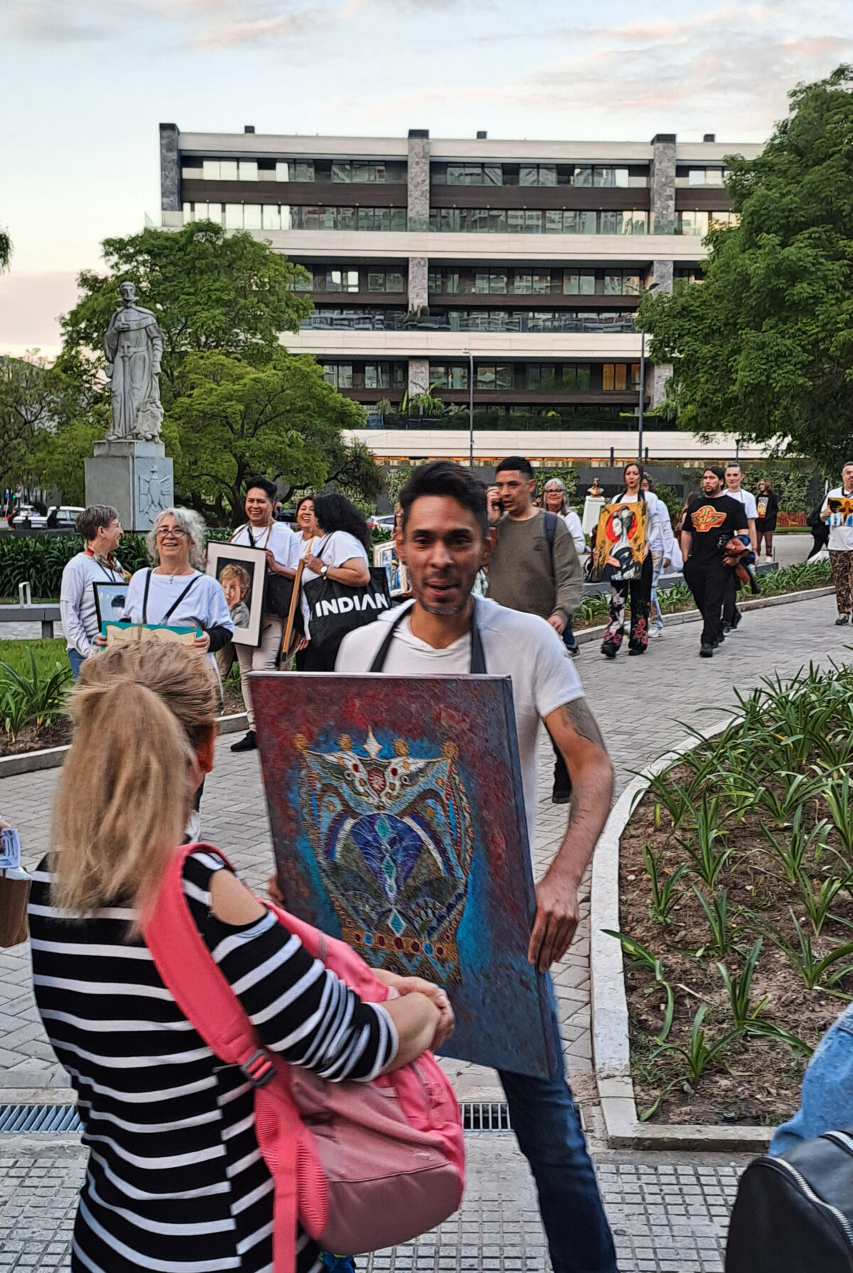 La iniciativa se llamó Arte en el pecho, y era la primera vez que se realizaba en Buenos Aires. Su creador, el artista venezolano José Antonio Perozo —conocido como JAP—, convocó a más de 20 artistas plásticos, aunque con una idea sencilla pero disruptiva: convertirse en galerías humanas, llevando sus cuadros literalmente sobre el pecho para darlos a conocer.