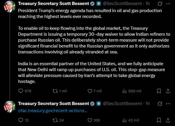 El Departamento del Tesoro de Estados Unidos autorizó este jueves 5 de marzo, una exención temporal de 30 días para permitir que cargamentos de petróleo ruso varados en el mar sean vendidos a refinadores indios.